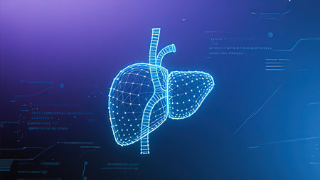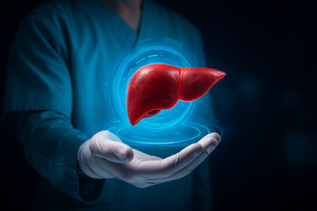 AI generated digital liver hovering over a gloved hand with glowing holographic interface and blue cyber background showing futuristic medical analysis and biotech innovation scene