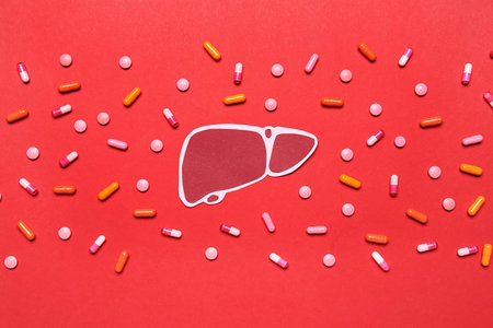 Paper liver with pills on red background