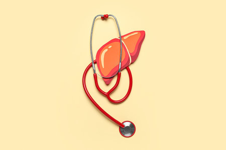Human organ liver model and stethoscope, top view. Human health and medical concept.