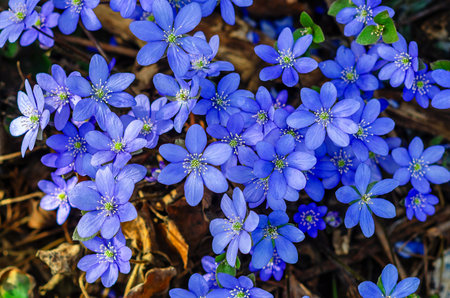 Spring forest flowers (Hepatica nobilis) on a sunny day.