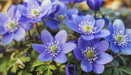Blue Hepatica flowers in the spring garden close-up on a sunny day