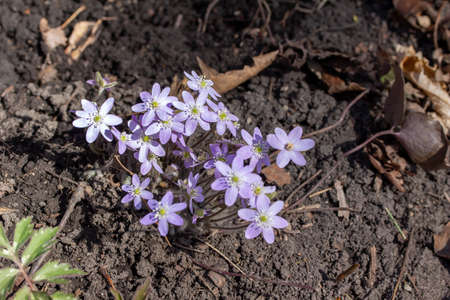 Violet Common Hepatica or Anemone hepatica on Spring Scene Flower Bed, blue blossoms close up. Liverleaf or liverwort plant in Ranunculaceae family.