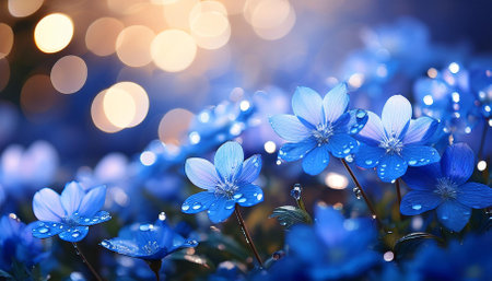 Delicate blue flowers flourish in a vibrant spring environment, illuminated by the enchanting glow of fireflies, creating a magical atmosphere during twilight hours.