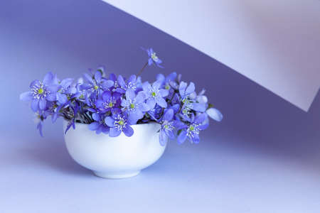 Fresh bouquet of delicate spring flowers liverwort Hepatica Nobilis in a white vase on a blue paper curl background