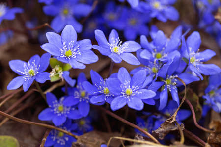 Macro close-up of first blooming tender Hepatica Snowdrop blue purple violet flowers in early spring forest