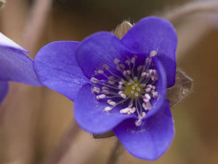 Violet. Macro of the blossom of a hepatica flower. The prime of the year. Early spring blue blossoms.
