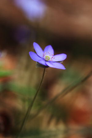 Hepatica nobilis, liverleaf or liverwort, blooming in dry leaves, macro, selective focus, shallow DOF