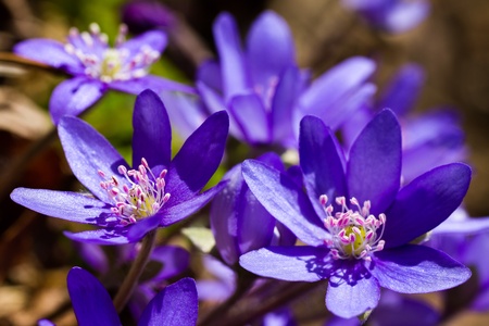 a cluster of deep blue flowering liverworts, Hepatica nobilis, which are one of the first flowering plants to bloom in spring