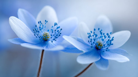 A cluster of fragile blue blossoms with tender petals and detailed stamens rests softly amidst a dreamy, pastel-toned background illuminated by gentle, diffused ligh