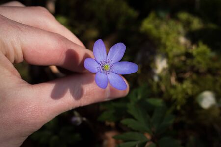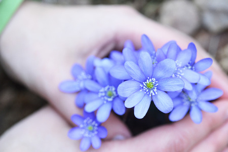 Hands are gathering hepatica or liverleaf, close up picture in spring