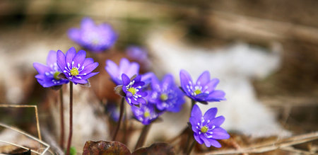Ground level view of lovely flowers in the woods. Concept of the ecology. Selective focus, blurred foreground. Template floral background. Flowering garden in spring time. Anemone hepatica.