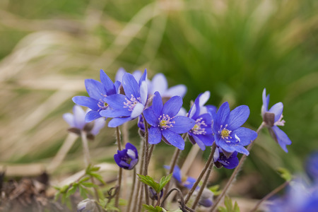 Beautiful blue springtime liverworts (hepatica nobilis) photographed in spring polish forest