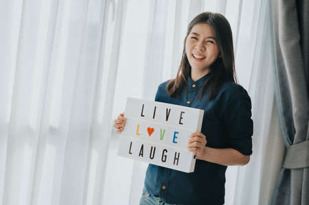 Happy Asian Woman holding live love laugh sign lightbox indoor