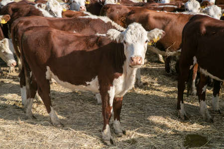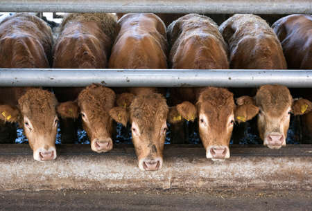 five limousin calves waiting for food inside open barn on organic farm in the netherlands near utrecht