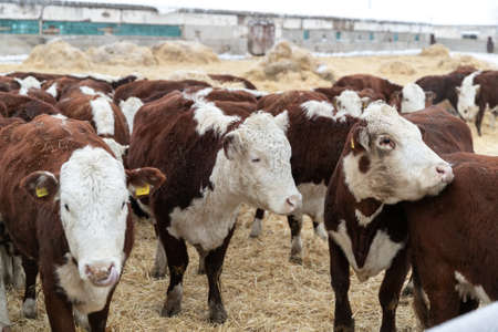 industrial cultivation of cows on a farm Cattle eating grass outdoors in winter