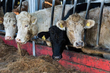 Cattle feeding on hay in cowshed at a dairy farm, ensuring optimal nutrition for the livestock