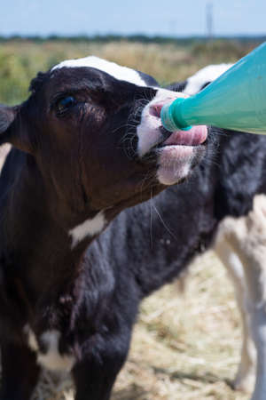 Calf drinking milk in bottle