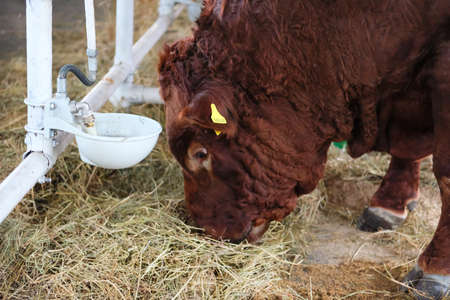 Brown bull eats hay on dairy farm. Concept of agriculture, farming and livestock.