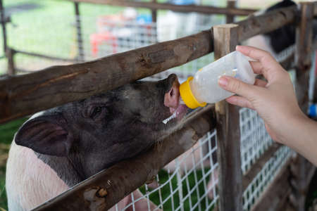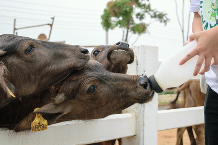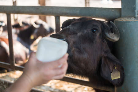 feed milk to buffalo on carabao farm in Chachoengsao province, Thailand. Animal park in byre.