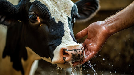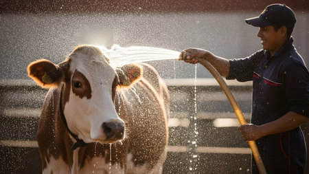 Farmer sprays cow with water from hose on sunny farm. Livestock care, animal hygiene, rural life, outdoor agriculture.