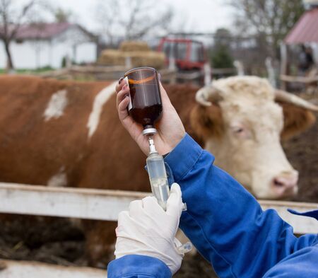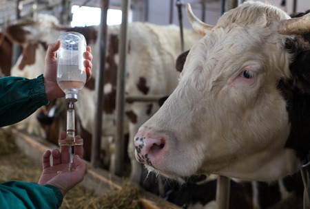 Young veterinarian preparing injection for cows in stable on farm. Health care in agriculture industry