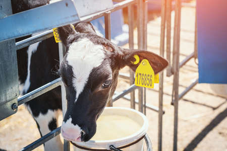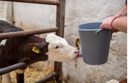 Farmer feeding baby animal simmental calf with milk from bucket with pacifier