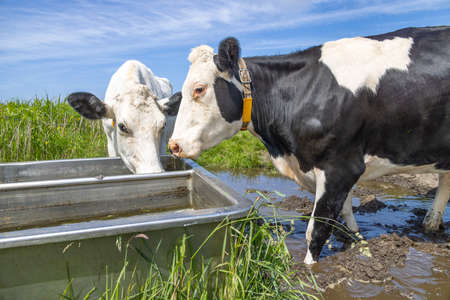 Herd of cows drinking water from a trough in the countryside.