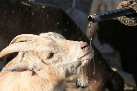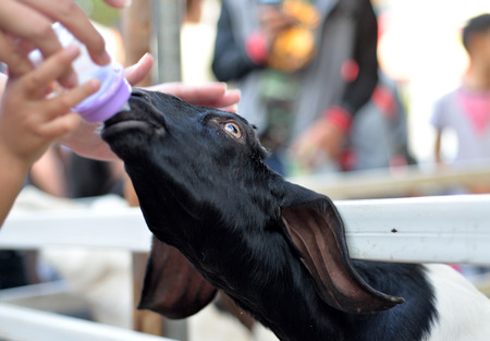 Little baby goat drinking bottled milk in a childrens farm