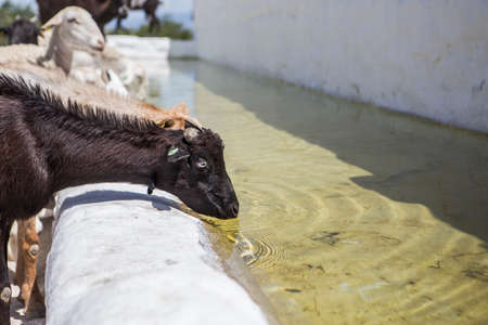 Herd of goats drinking water in a watering hole next to the castle of Sabiote in Andalucia, Spain