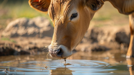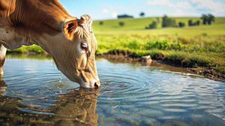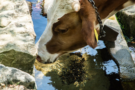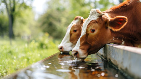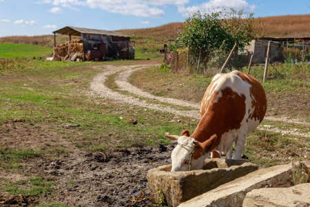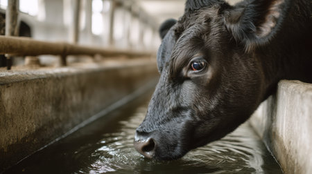 Portrait of a cow drinking water from a manger on a ranch