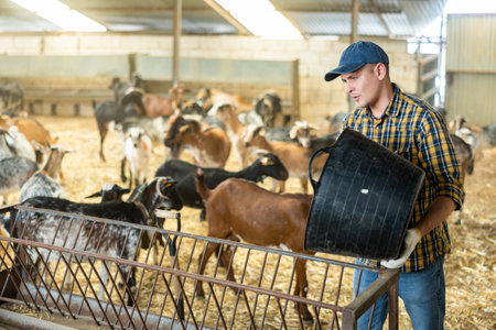 Young European man farmer taking care of dairy goats with hay organic food. Meat and milk production.