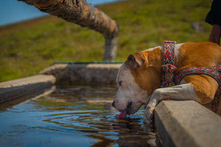 Pit bull terrier in mountains on green grass with water wooden drinker