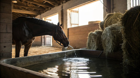 Horse drinking water from a trough at a stable in France.