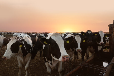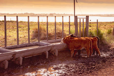 Group of cows drinking water at sunrise. Cattle in the corrals of a field in Buenos Aires