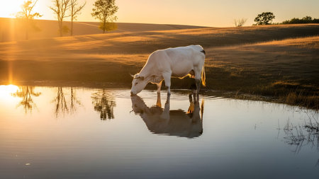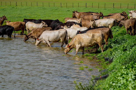 Cows, cattle at the watering hole. Background with copy space for text or inscriptions. Selective focus