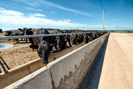 Brahman meat cows calf at Texas farm. Growing meet cows. Cattle supplementary feeding.