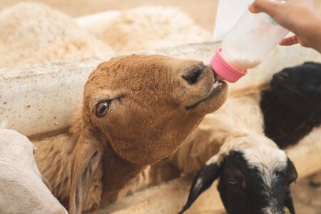 Close up hand is feeding milk bottle for sheep in the farm.