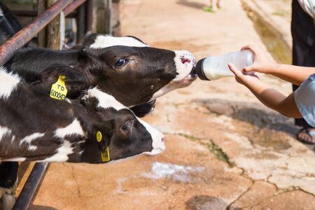 Closeup - Baby cow feeding on milk bottle by hand child in Thailand rearing farm.
