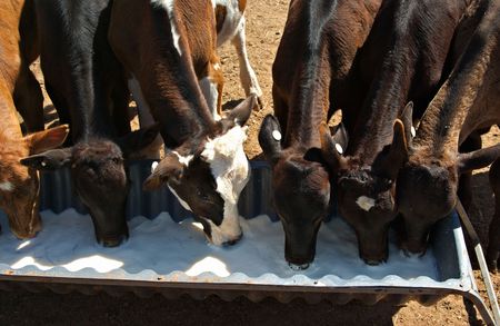 Cattle drink from water from a trough on a farm