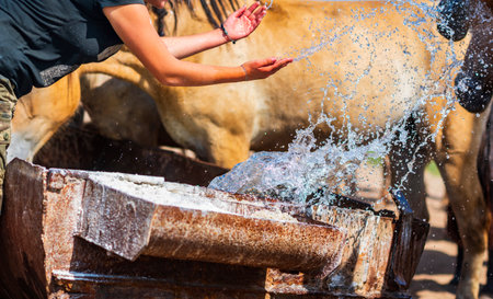female farmer fixing a water trough on a farm. angus calm cow drinking water out of a round trough. livestock water trough in a field on a cattle farm in Australia