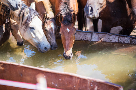 Horses drink water from a through. Close-up photo.