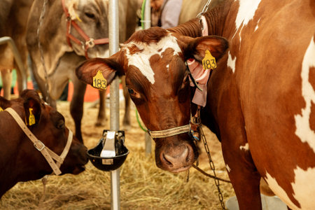 Modern automated farm for breeding red Jersey cows. Meat, milk, cheese livestock industry