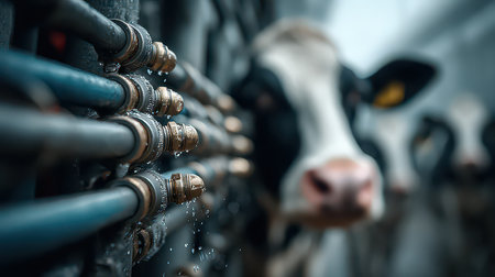 Process of machine milking of cows on farm. Back view of cows with milking clusters on udders
