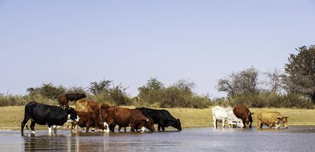 A group of cows drinking water in a river, in a lake, in Africa