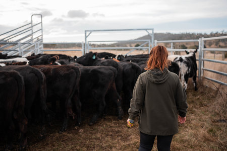female farmer herding cows on a farm, growing and working with the land and growing meat. women in agriculture producing Angus, wagyu, Murray grey cattle, being grown in a farm in Australia.
