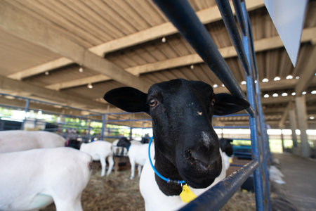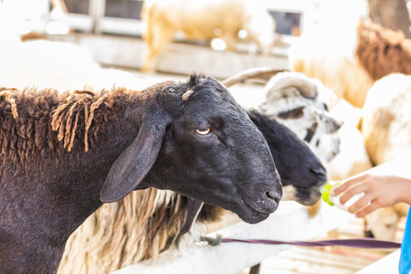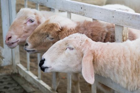 closeup on white sheep face in stables show up it head to wait for people feed them