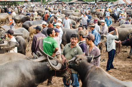 UBONRATCHATHANI, THAILAND - SEPTEMBER 7, 2014 : Unidentified people buying and selling buffalo and other animals at market. This is the most famous buffalo market in the northeast of Thailand.