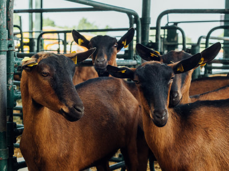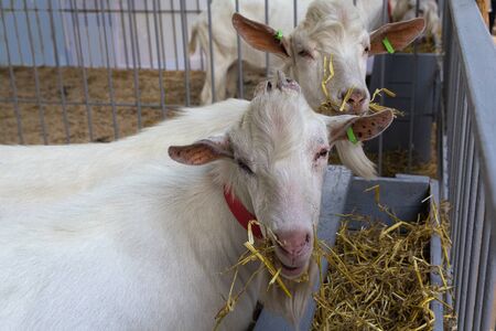 Pedigree breeding goats in a pen for animals on a farm. Breeding of different breeds of cattle. Farming, animal husbandry