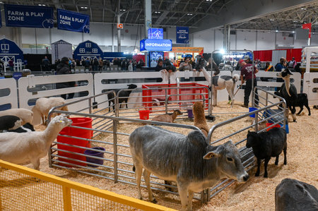 Toronto, ON, Canada - November 14, 2025: Visitors interacting with farm animals including a cow, sheep, alpaca, and llama in a petting zoo at an agricultural fair
