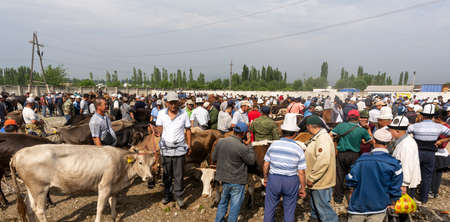 Osh, Kyrgyzstan - June 30, 2019: Livestock market with man and cattle in Osh, Kyrgyzstan.